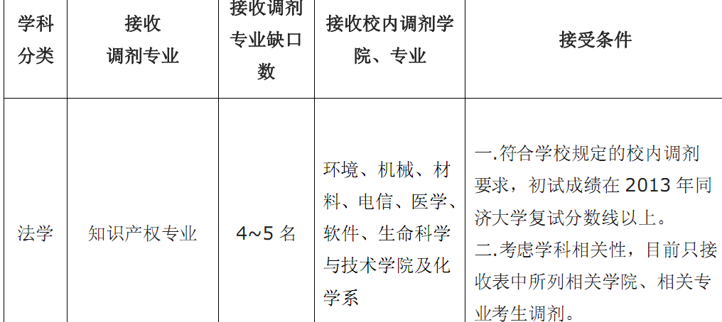 为适应社会对具有理工科知识背景的知识产权人才的需要,我院今年继续从符合同济大学调剂要求的学生中招收部分学生进入法学院知识产权专业学习,拟接收的专业及相关要求如下: