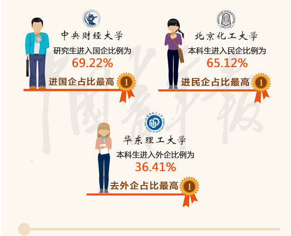 比如北京大学,该校2013年本科生进入国企的比例为25.26%,进入民企的为13.89%,而今年,前者降至14.57%,后者则升至41.52%。