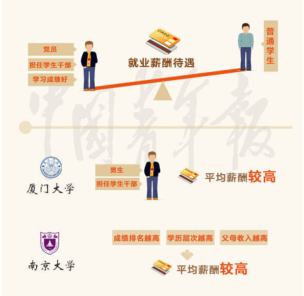 梳理发现,担任过学生干部、专业成绩好等都能成为高薪的理由。厦门大学年报提及,男生、担任过学生干部的平均薪酬较高。