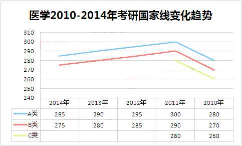 下面是2010-2014年医学考研分数线变化趋势,希望能帮助大家更好的根据自身情况做分析对比。