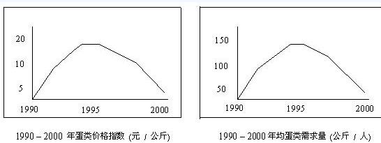 正如上面两张曲线图所示,从1990年到1995年蛋类的平均价格不断上升,并且其需求量也相应增加。曲线图还表明,从1995年到2000年期间蛋类价格下降,而且需量也下降。这种现象是很奇怪的并值得研究。根据市场经济法则,需求量增加会引起价格上涨。也就是说,当价格上升时,需求就下降,而当价格回落时,需求就增加。但是现在的现实恰好相反。