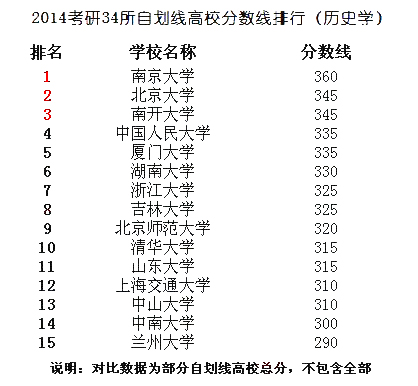 2014年考研国家线历史学专业A类复试线为310分,较2013年295分上涨15分;历史学专业B类复试线为300分,较2013年285分上涨15分。