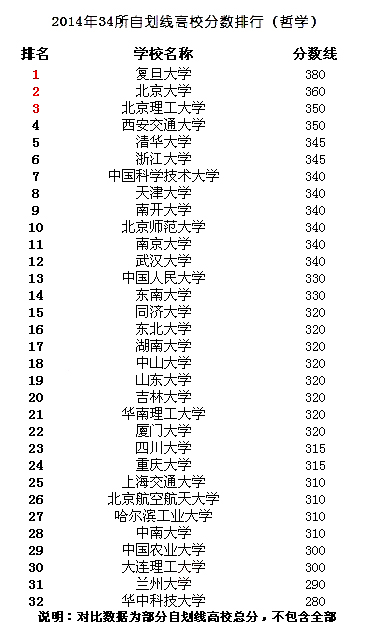 34所自划线院校2014哲学专业考研复试线排行榜