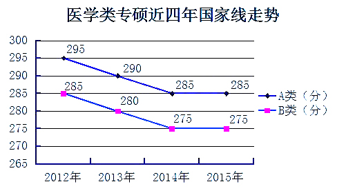 医学类专硕的A类考生国家线由2012年的总分295下降5分至2013年的290分,2014年再次下降5分至285分,2015年与2014年持平仍为285分。B类考生国家线变化趋势及幅度与A类考生相同,2012年的总分285下降5分至2013年的280分,2014年再次下降5分至275分,2015年与2014年持平仍为275分。经济类专硕近四年国家线整体走势:下降↓-下降↓-持平