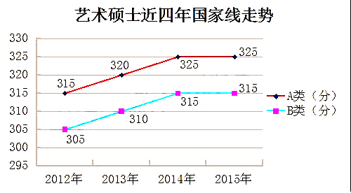 艺术硕士的A类考生国家线由2012年的总分315分上涨5分至2013年的320分,2014年再次上涨5分至325分,2015年与2014年持平仍为325分。B类考生国家线变化趋势及幅度与A类考生相同,2012年的总分305分上涨5分至2013年的310分,2014年再次上涨5分至315分,2015年与2014年持平仍为315分。艺术硕士近四年国家线整体走势:上涨↑-上涨↑-持平