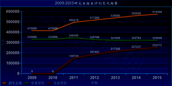 从上图可以明显看出,研究生招生总趋势一直呈增长态势。2010年教育部新增19种专业硕士,到现在为止已有39种。2016年中医硕士将开始招生。因此,从2011年开始,学术硕士招生逐渐呈下降趋势。与此同时,专业硕士招生数量逐年增长。