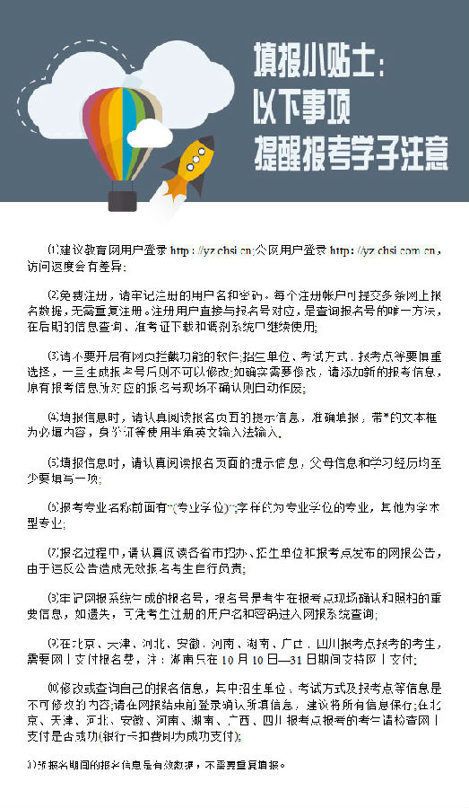 2016考研网上报名今天(10日)开始。按照教育部统一安排,10月10日至31日每天9:00-22:00,考生可登陆研招网进行网报。大家要注意错开拥堵时段,尽量少出问题。下面三张图帮助考生熟悉了解报考流程及相关注意事项。