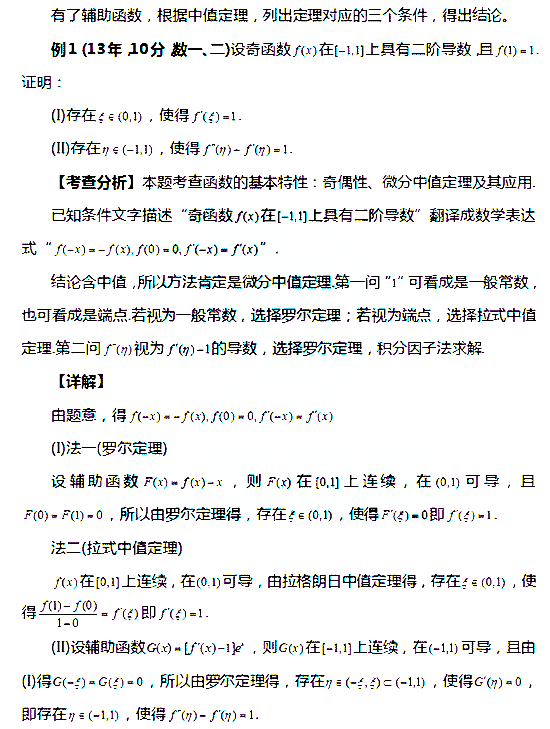 涉及到微分中值定理,一般首先要找辅导函数。针对拉式中值定理和柯西定理,经过对要证明的结论化为标准形式,可直接得出辅助函数。而罗尔定理,需要把结论化为微分方程的一般形式,使用积分因子法可找到。
