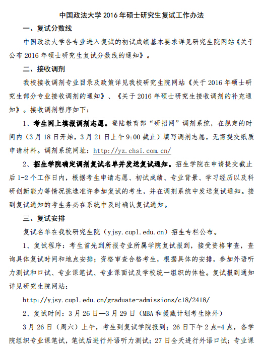 据中国政法大学研究生院消息,2016年中国政法大学考研复试工作办法已经公布,详情如下: