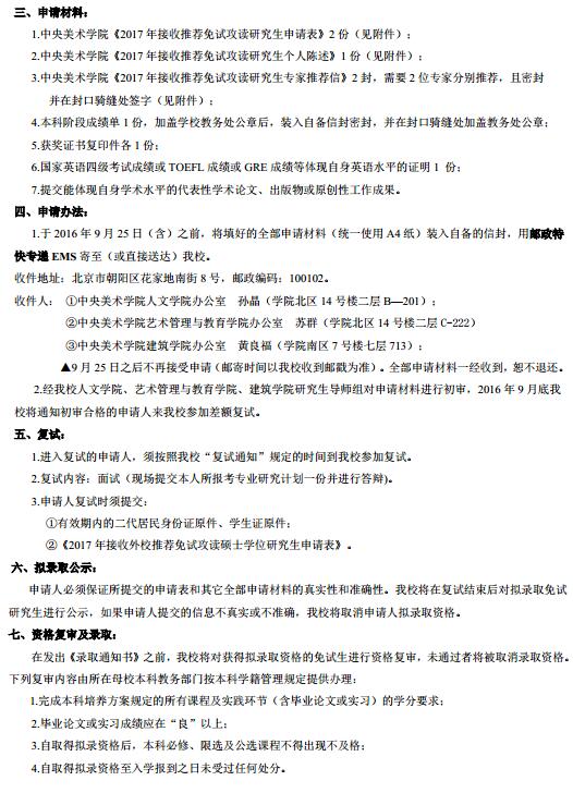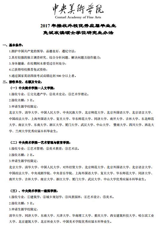 中央美术学院2017年接收外校优秀应届毕业生免试攻读硕士学位研究生办法