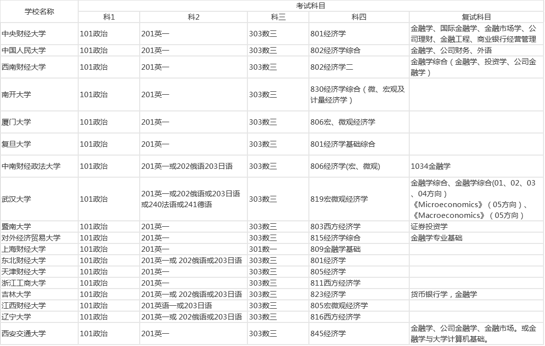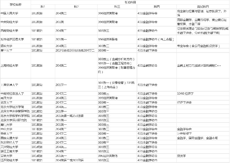 注:一些高校,如中山大学、上海交通大学的金融学专业只收推免生,因此表中没有列出该校的考试科目。