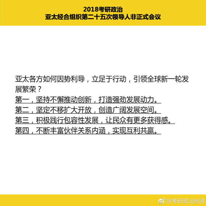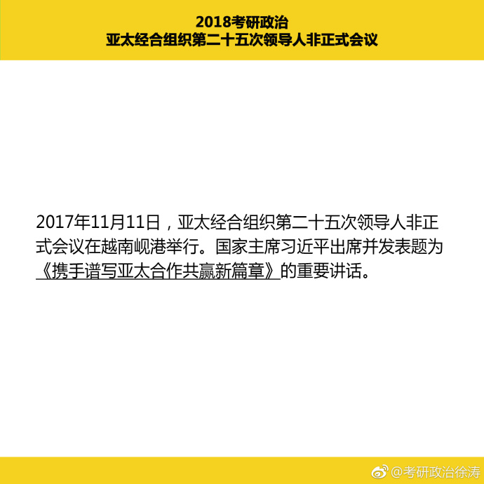 2018考研政治冲刺复习进行到11月中旬,其实时政也就差不多都出来了,再往后,一般的时政都不会再进入考卷了,这个月的时政主要以Apec为最大亮点,尤其是工商领导人峰会上的讲话,其他的事件简单了解即可,可考性不强!下来看下有关Apec需要掌握的几个重要内容,一起来学习吧!