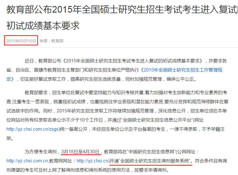 2015考研:3月10日公布国家线,3月18日开通调剂系统。