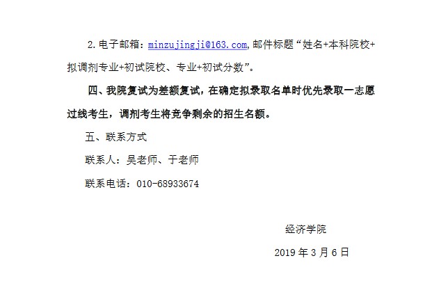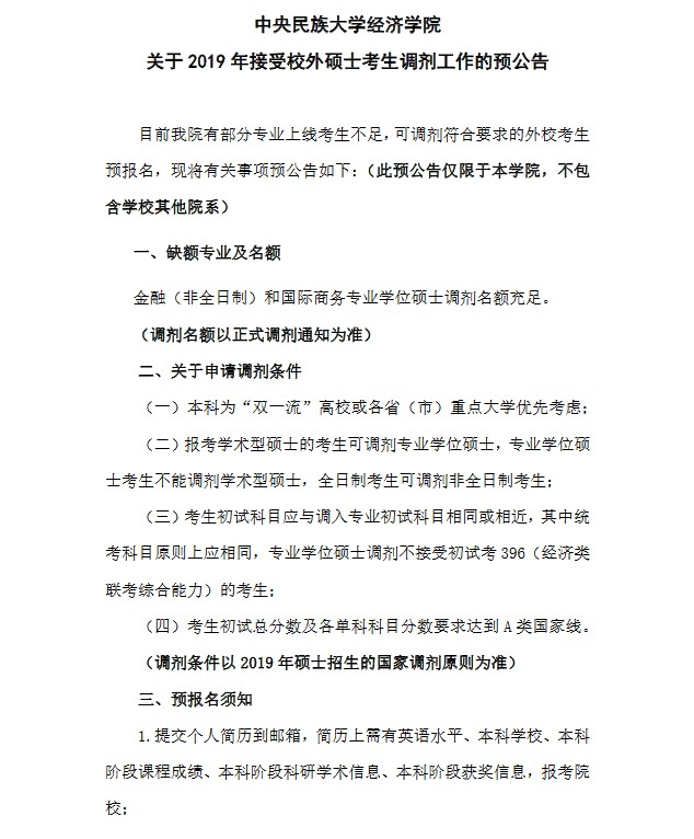 据中央民族大学研究生院消息,2019年中央民族大学经济学院考研预调剂公告已出,详情如下:
