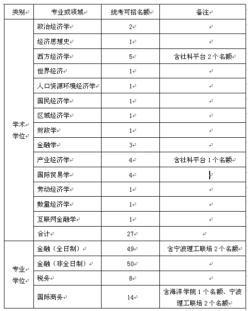 经济学院2019年统考硕士研究生招生计划(少数民族骨干计划、退役大学生士兵计划指标除外)如下: