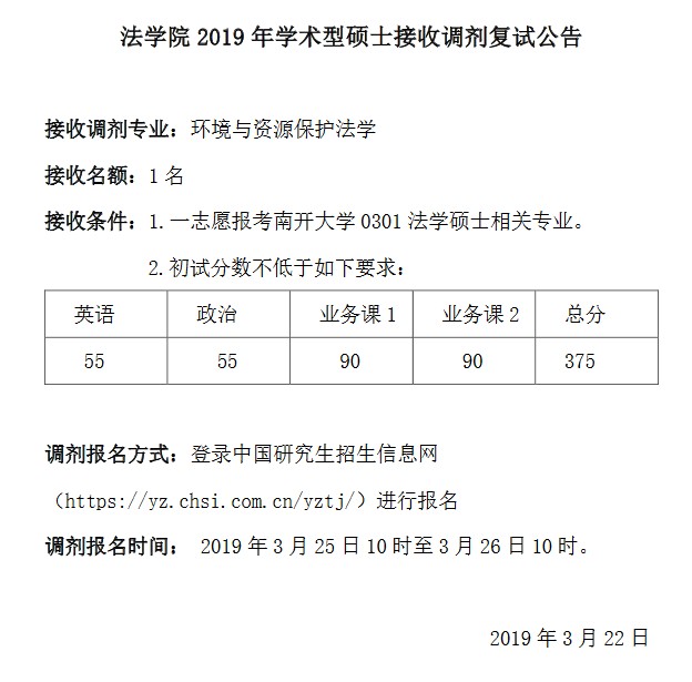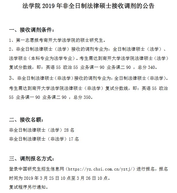 据南开大学研究生院消息,2019年南开大学法学院考研调剂信息已出,详情如下: