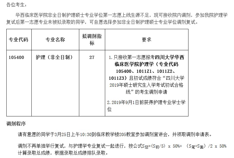 据四川大学研究生院消息,2019年四川大学华西临床医学院护理专硕(非全日制)考研调剂信息已出,详情如下: