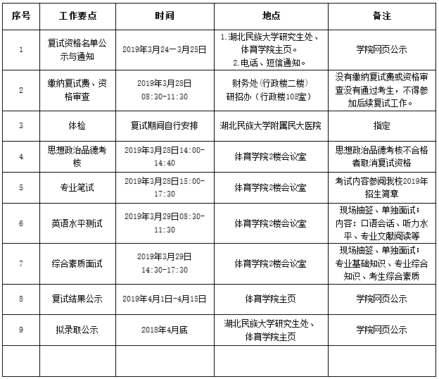 体育学院2019年硕士研究生招生复试录取工作全流程包括:
