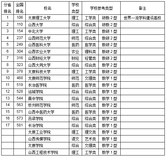 山西省选取21所普通本科大学。山西省大学教师学术水平0.4342,全国第22名。教师绩效0.5928,全国第21名。2018年毕业博士生720人,全国第20名。毕业本科生83160人,全国第18名。2017年毕业硕士生10136人,全国第23名。