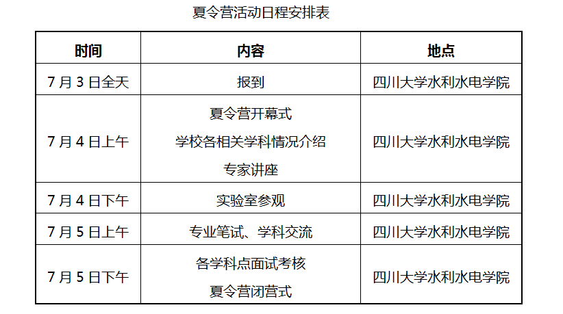 2、夏令营活动中将会对所有营员进行笔试、面试考核。考核通过的优秀营员名单于2019年7月下旬在四川大学水利水电学院主页(http://cwrh.scu.edu.cn/)公布。
