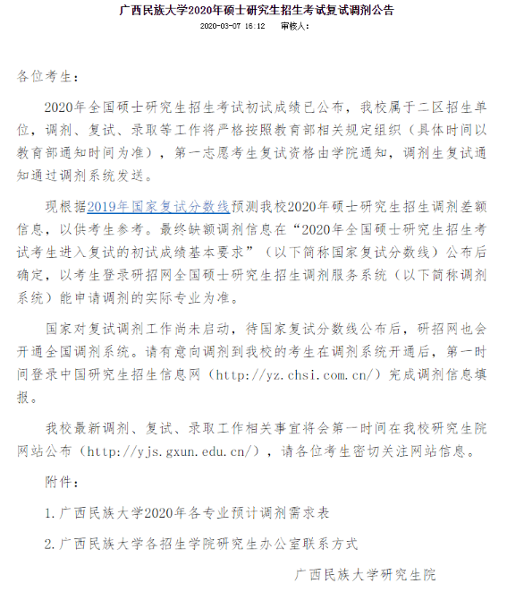 以上就是广西民族大学2020考研调剂通知。友情提示,在2020考研国家线公布后,可能会发生变化,以上信息介绍仅供大家参考。更多2020考研调剂信息,持续更新中