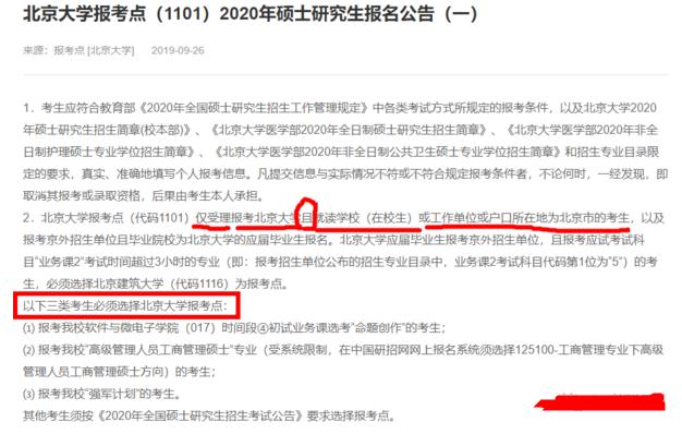 举个栗子:北京大学部分专业要求必须在北大考试,其他考生按《2020考试公告》选择报考点;