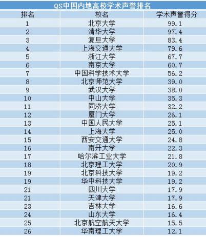 如何评价高校的学术声誉?QS采用的是“同行评议”,如果一所大学在优秀学者当中的认可度比较高,那这所大学的学术声誉得分就比较高。前段时间,QS发布了最新的世界大学排名,那么,在学术声誉这项指标上,我国内地哪些高校得分比较高呢?我们先来看一下具体得分: