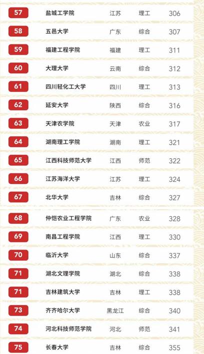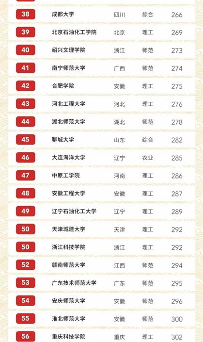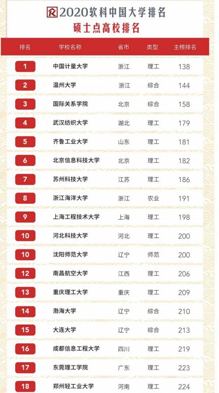本文从2020软科中国大学排名(主榜)中单独提取了有硕士点,但暂无博士点的高校,经统计共97所高校。其中中国计量大学、温州大学和国际关系学院分列前三甲,武汉纺织大学位居第4名,齐鲁工业大学排名第5。