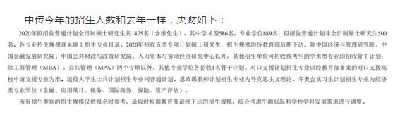 中国传媒大学2020年硕士研究生(含全日制及非全日制)招生计划为1600人左右(含推免以及各类专项计划),实际招生人数按国家当年下达具体招生计划为准。各专业拟招收人数请参阅《中国传媒大学2020年攻读硕士学位研究生招生专业目录》,各专业的实际招生人数将根据国家当年下达招生计划和生源情况最终确定。