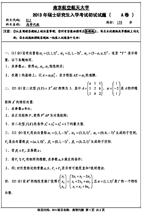 以上就是为考研人分享的:南京航空航天大学2013年814高等代数初试考研真题,希望能为大家考研复习带来帮助,预祝大家考研成功。