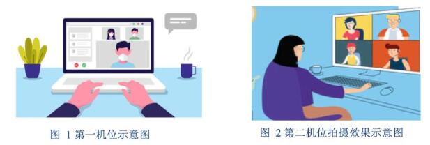 4.机位设置。考生需要准备可以支撑“双机位”运行的硬件,即需要两部带摄像头的设备及附件,第一机位可以是电脑或手机,第二机位只能为手机(建议第一机位首选有线网+电脑)。复试开始后,考生需首先将第二机位的摄像头360度环顾四周,以确保复试环境符合要求。一台设备(第一机位)从正面拍摄,放置在距离本人30cm处,另一台设备(第二机位)从考生侧后方45°距离本人30cm处拍摄,确保第一机位和第二机位分别从考生面前和身后完整拍摄到考生全身,复试组考官能够从第二机位清晰看到第一机位屏幕。效果图如下: