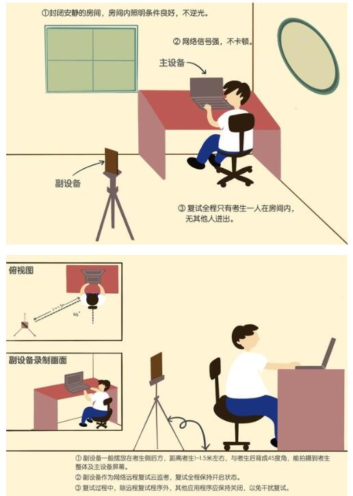 (六)主机放置在考生座位正前方,音频视频必须全程开启。考生全程正面免冠朝向摄像头,保持注视主机摄像头,视线不得离开。保证头肩部及双手出现在视频画面正中间。不得佩戴口罩,保证面部清晰可见,头发不可遮挡耳朵,不得戴耳饰、耳机。另一台辅助机放于考生右后方45度位置,确保监控范围覆盖第一台设备的显示屏幕和考生本人头部、背部、手部。考生须根据考务人员远程要求,及时进行视频角度及清晰度调整。
