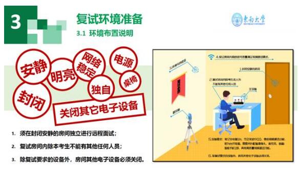 请考生认真阅读《东南大学研究生招生在线面试平台考生操作指南》,熟悉复试流程,并按要求做好面试准备。