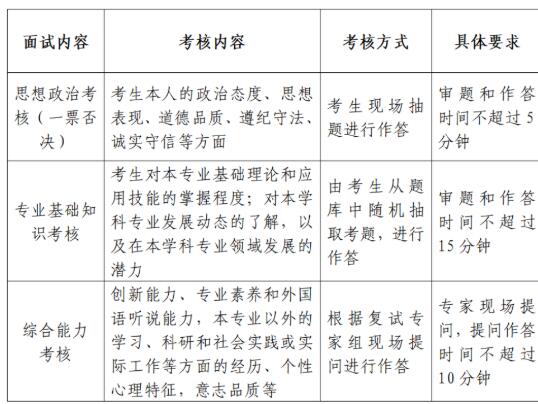 ③ 考核方式:复试采取百分制打分标准。思想政治考核不计入面试总成绩,考核不合格不予录取。复试成绩(100分)=专业基础知识考核(60分)+综合能力考核(40分)。