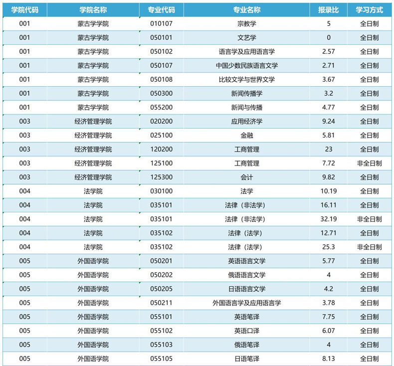 内蒙古大学2023年硕士研究生招生专业普通计划一志愿报录比已公布!具体可查看下文: