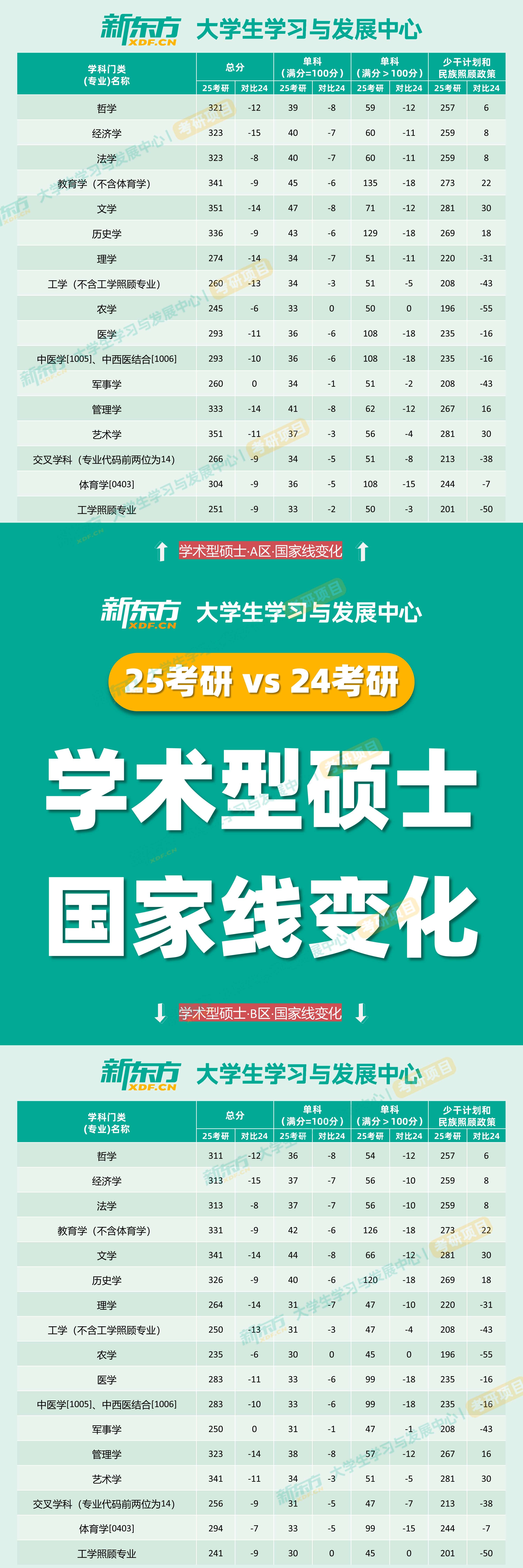 新东方2025年考研国家线vs24考研国家线变化(学术类)