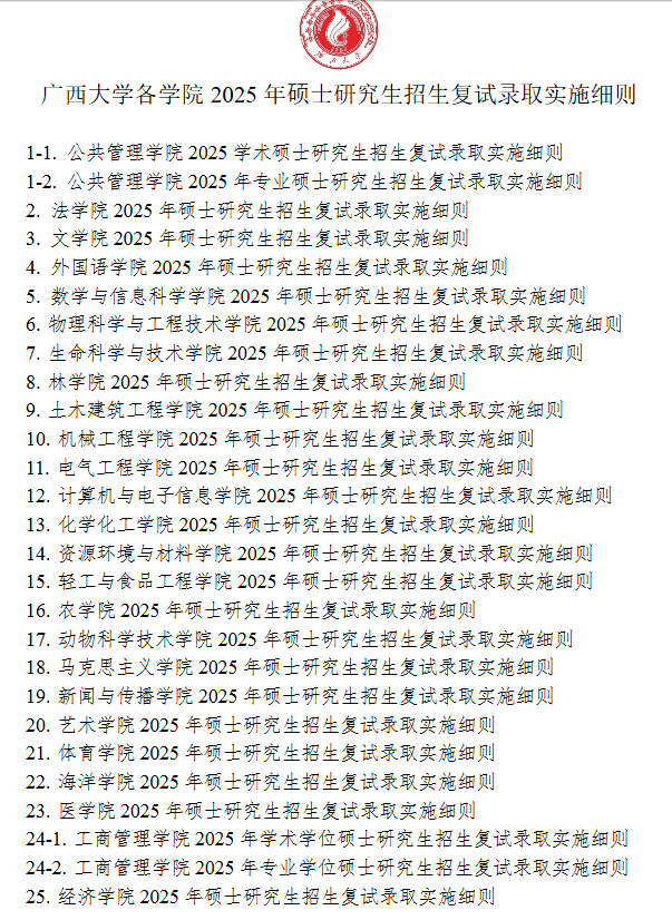 广西大学各学院2025年硕士研究生招生复试录取实施细则