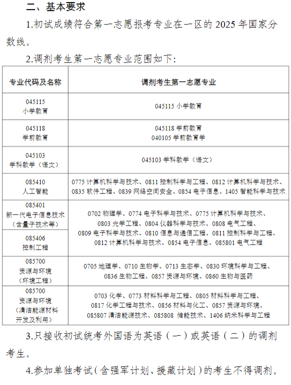 根据教育部《2025年全国硕士研究生招生工作管理规定》(教学〔2024〕4号)、《关于做好2025年全国硕士研究生复试录取工作的通知》(教学司〔2025〕4号)等文件精神及上级部门关于调剂工作的部署,结合我校工作实际,制定本方案。
