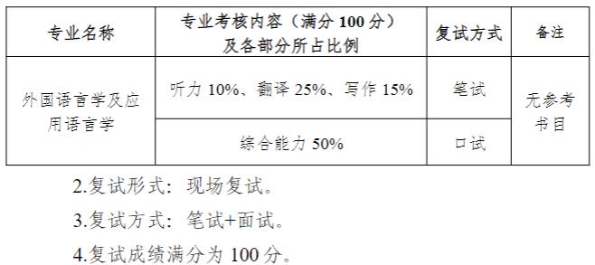 复试主要分为专业考核与思想政治考核。其中专业考核的成绩满分为 100 分,思政考核结果分为“合格”与“不合格”。思政考核结果不合格的考生不予录取。根据外语专业的特点,专业考核的内容和方式主要分为: