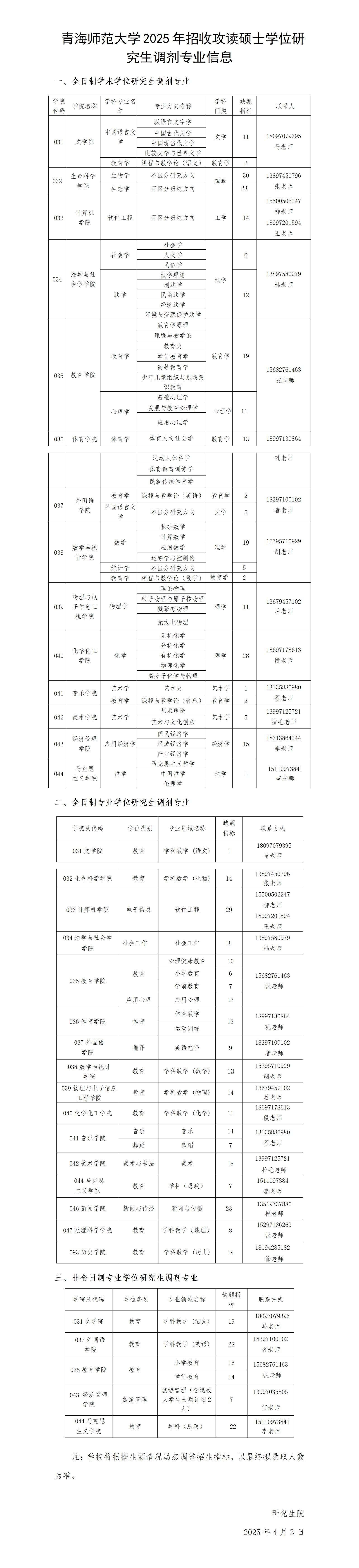 我校需要调剂的学科专业见“青海师范大学2025年招收攻读硕士学位研究生调剂专业信息”。