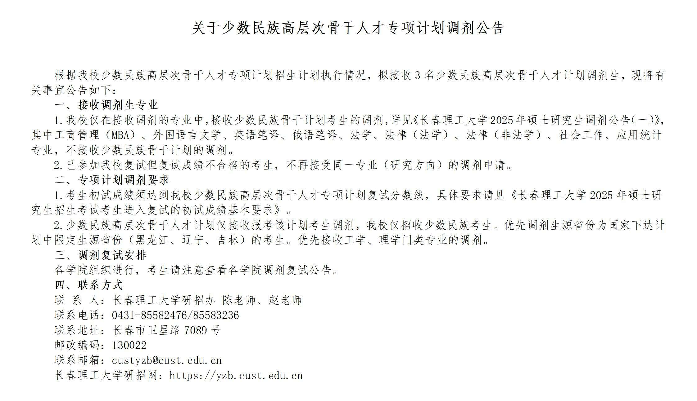 以上就是关于“长春理工大学少数民族高层次骨干人才专项计划调剂公告”的介绍,更多有关2025年考研调剂的内容,请持续关注本频道的更新!