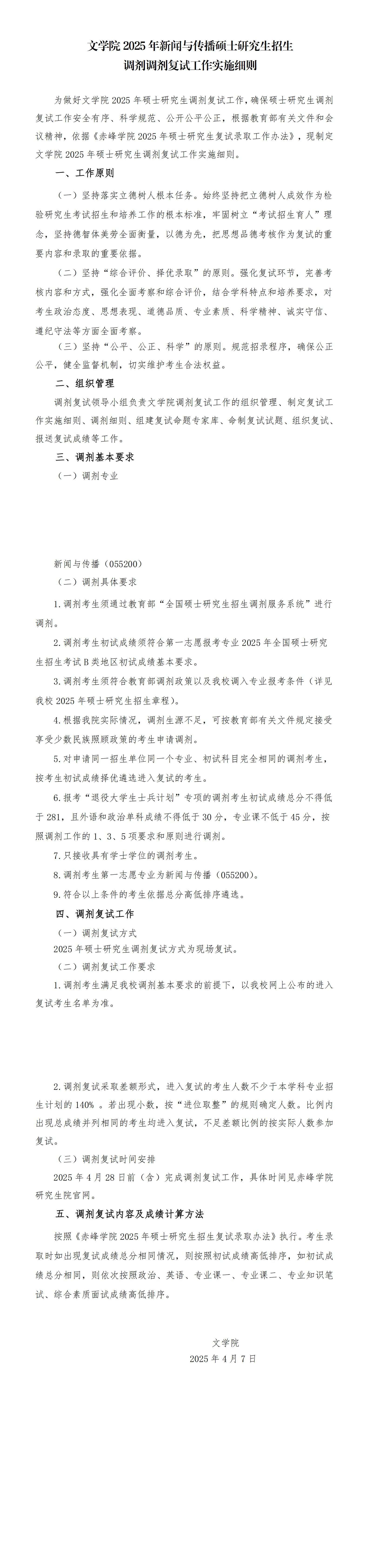 赤峰学院文学院2025新闻与传播硕士调剂复试细则