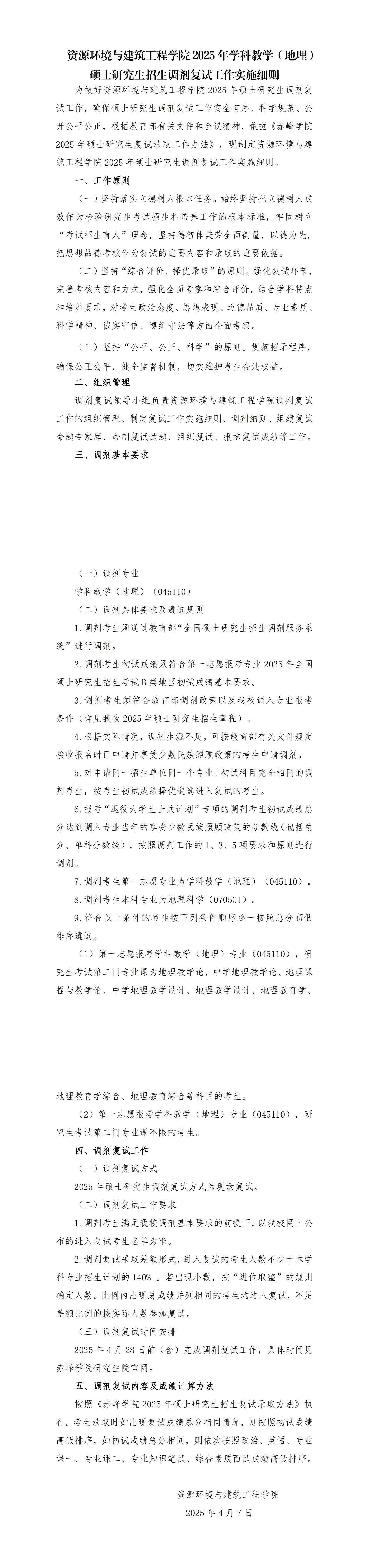 赤峰学院2025年学科教学(地理)硕士调剂复试细则