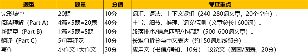 2026考研英语一(科目代码是 201),主要面向学术型硕士(学硕),部分专业型硕士(专硕)也可能要求考英语一。英语一的题型、分值及考查重点如下,综合最新考试趋势和备考建议,帮助考生系统掌握考试要求: