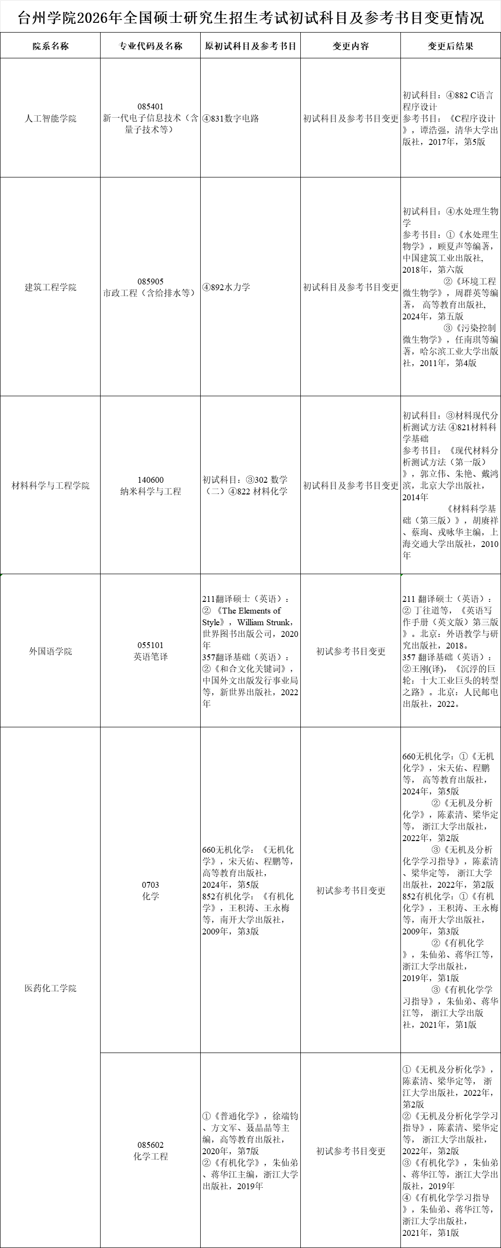 台州学院2026年考研招生考试初试科目及参考书目变更公告