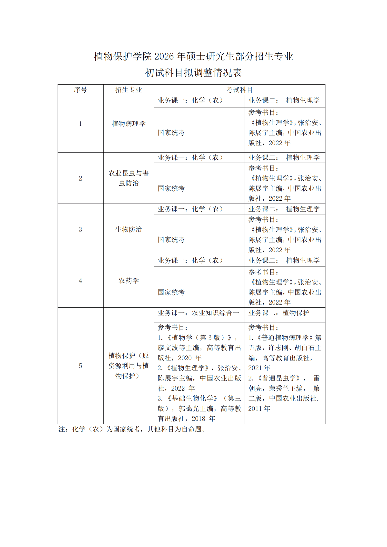 吉林农业大学菌物学院2026考研初试科目调整表