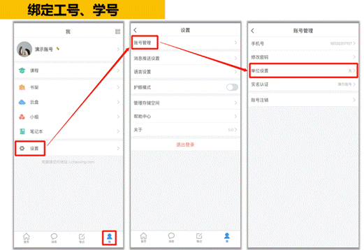 若之前有账号,登录成功后,也需要添加单位绑定。点击底菜单“我--设置--账号管理--单位设置”处,查看是否显示正确的学校名称和个人学号,正常显示即为绑定成功。若无学校和学号显示,则需要点击页面下方“添加单位”,增加单位绑定。