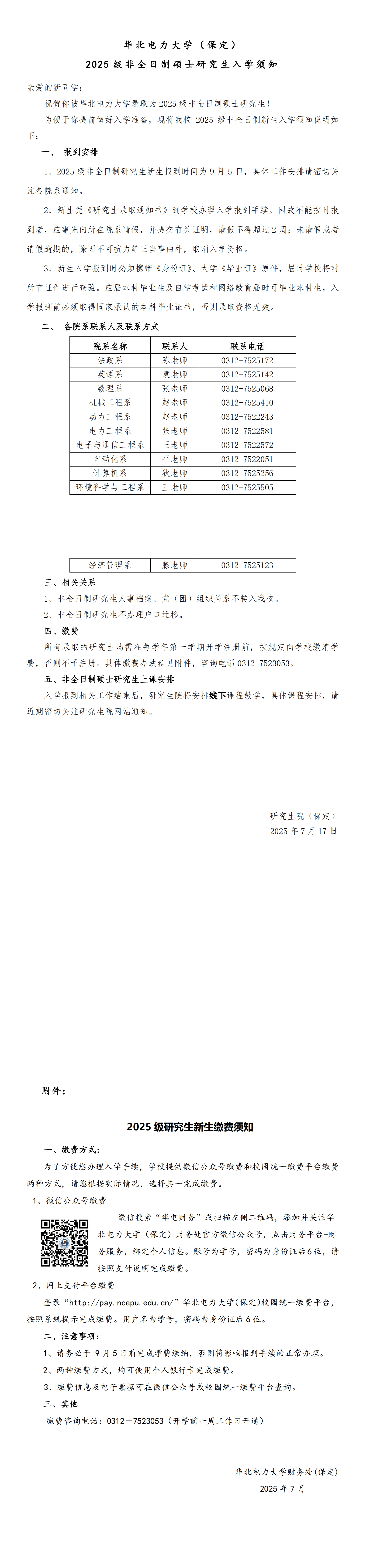 华北电力大学(保定)2025级硕士研究生入学须知(全日制)