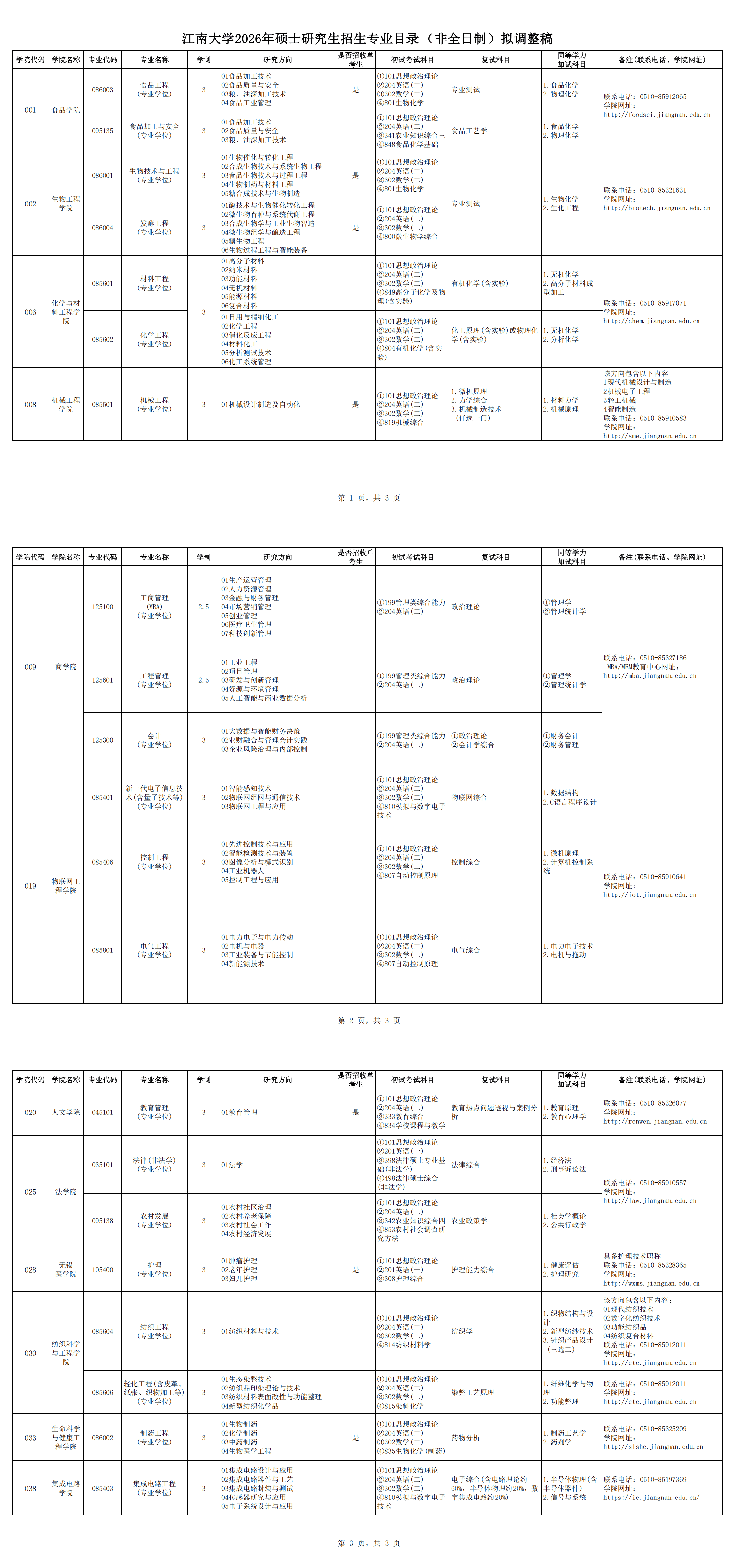 根据各学院研究生招生工作小组研究确定的修订结果,现公布我校2026年硕士招生专业目录(含考试科目)拟调整稿和自命题科目考试大纲,供广大考生参考。说明:因教育部2026年硕士研究生招生相关政策尚未公布,各学院根据2025年相关政策确定以下拟调整方案,最终方案以教育部2026年硕士研究生招生相关政策公布后经学校研究生招生工作领导小组审核、我校正式公布的“江南大学2026年硕士研究生招生目录”和自命题科目考试大纲为准。