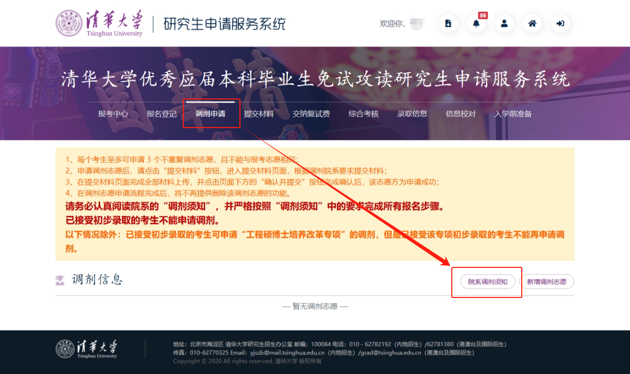 请考生于2025年9月12日13:00—2025年9月13日13:00期间,登录清华大学研究生申请服务系统(https://yzbm.tsinghua.edu.cn/),进入推免生招生系统后,如下图所示页面,在【调剂申请】页面下点击“调剂须知”,可看到各调剂院系维护的调剂须知。